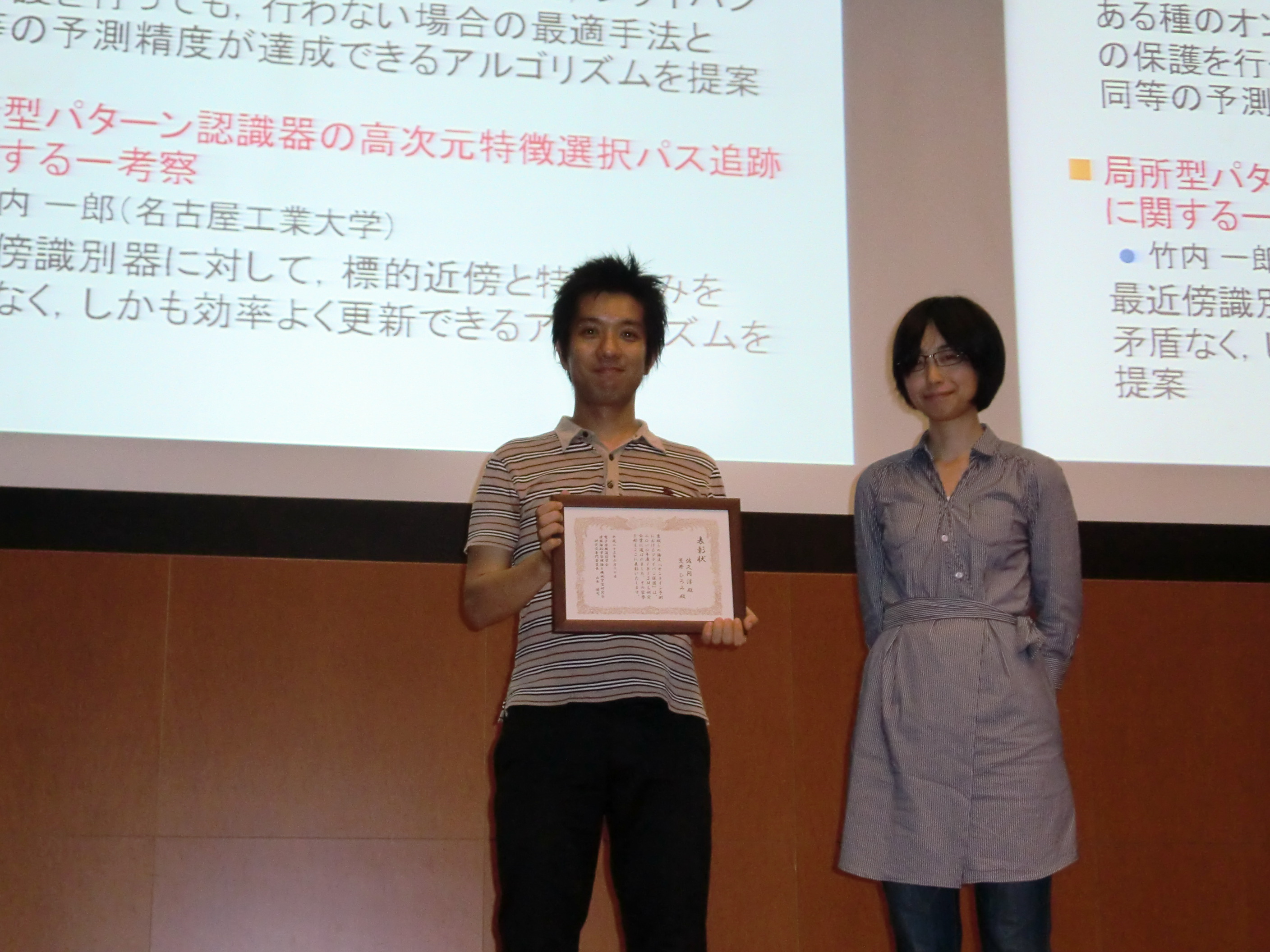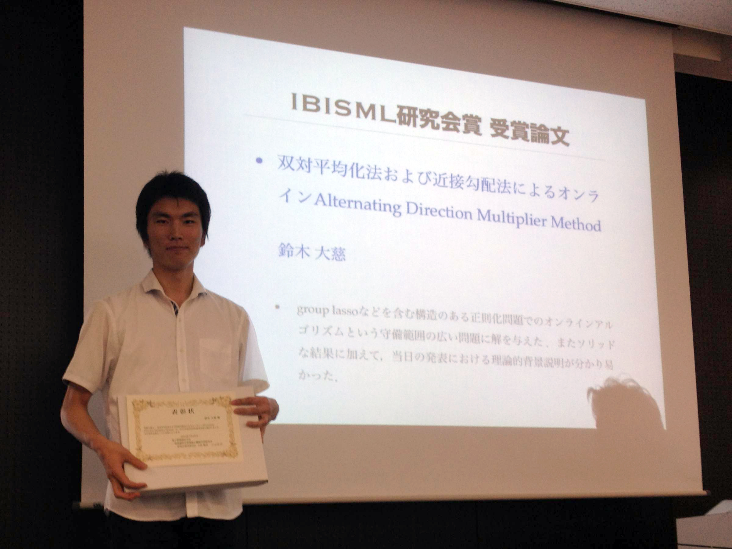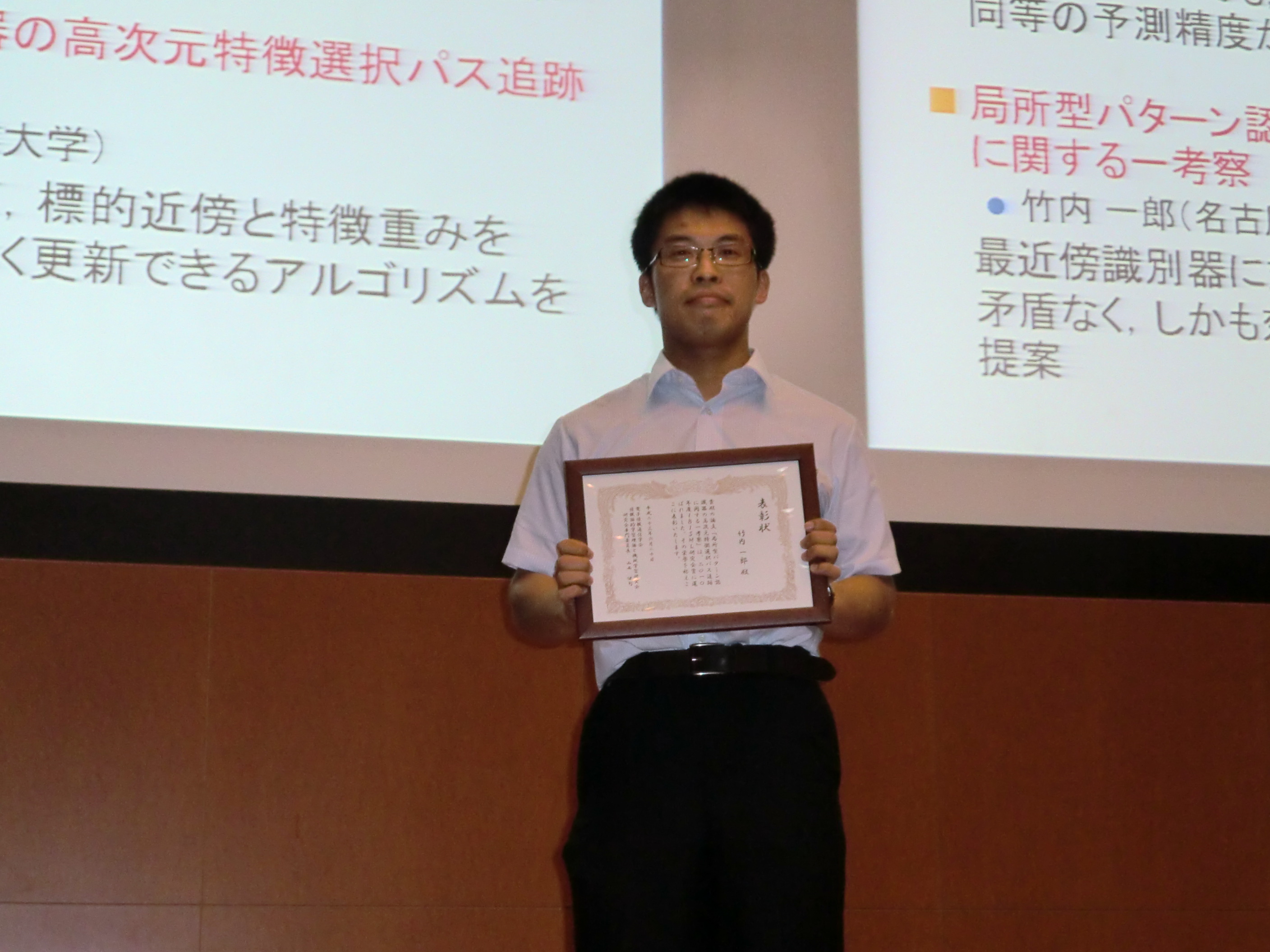授賞理由:group lassoなどを含む構造のある正則化問題でのオンラインアルゴリズムという守備範囲の広い問題に解を与えた .またソリッドな結果に加えて,当日の発表における理論的背景説明が分かり易かった.
