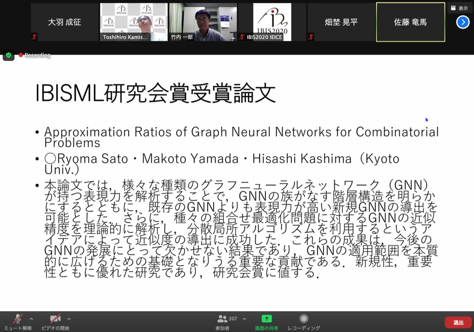 本研究会賞の受賞者は「情報論的学習理論と機械学習 (IBISML) 研究会賞選奨規程」に従い選出されます。